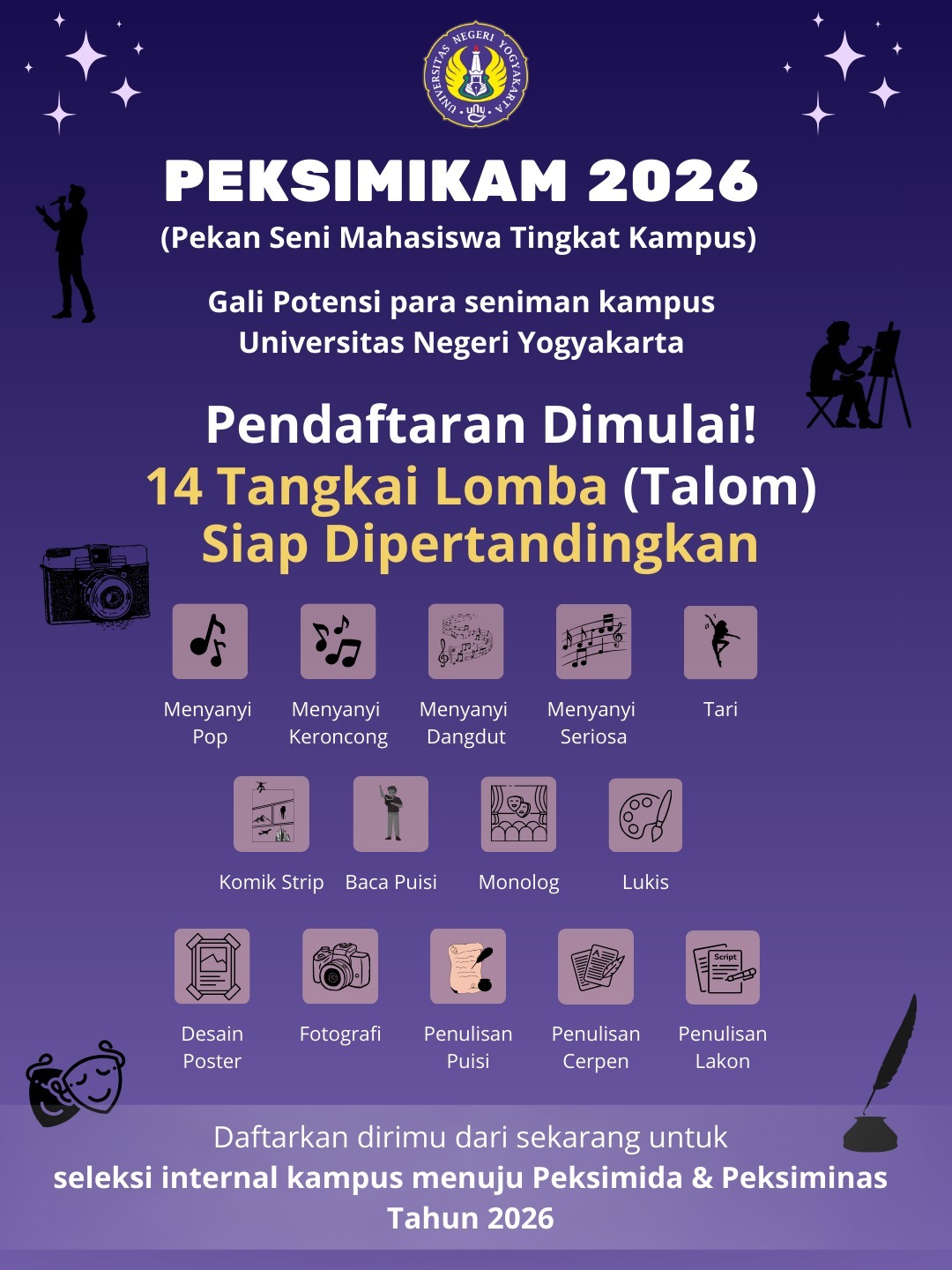 Sebanyak 14 tangkai lomba seni mahasiswa dipertandingkan dalam PEKSIMIKAM 2026, meliputi cabang menyanyi, tari, sastra, musik, teater, hingga seni rupa. Seluruh mahasiswa aktif Universitas Negeri Yogyakarta berkesempatan untuk mengikuti seleksi sesuai bidang seni yang diminati.
