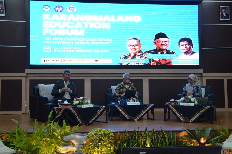 Dewan Pimpinan Pusat Ikatan Alumni Universitas Negeri Yogyakarta (DPP IKA UNY) menyelenggarakan Karangmalang Education Forum (KEF) sebagai ruang diskusi strategis untuk merespons perkembangan kecerdasan artifisial (Artificial Intelligence/AI) dalam dunia pendidikan. Forum bertema ‘AI dan Peningkatan Mutu Pendidikan Untuk Semua’ ini berlangsung secara hybrid pada Sabtu, (24/1/26), di Ballroom Gedung IKA UNY, diikuti peserta secara luring dan daring melalui Zoom Meeting.